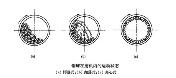球磨機(jī)是選礦設備(bèi)中(zhōng)常用的設備之一。轉(zhuǎn)速是球磨機設計和操作的主要參數之一,轉速(sù)大小直接決定著筒體(tǐ)內磨礦介質的運動狀態(tài)和磨礦作業的效果。轉速過(guò)快或過慢都會減弱或失去粉碎作用。本(běn)文介紹不同轉速下不同的磨礦(kuàng)作用效果。