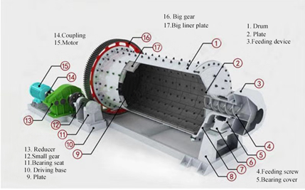 和幹式球磨機的外(wài)形和(hé)部件(jiàn)基本相(xiàng)同(tóng),筒體為圓柱(zhù)形,結(jié)構主要包括給料部、出料部、回轉部(bù)、傳動(dòng)部(減(jiǎn)速機,小傳動齒輪,電機,電控)等。